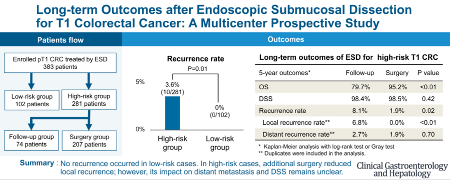 研究结论对于低危T1期CRC患者,单纯ESD治疗已显示出良好的效果,该组患者中未观察到复发或疾病特异性死亡,提示根治性ESD可能已达到治疗目标,术后或无需进行密切随访。然而,对于高危T1期CRC患者,尽管补充手术显著降低了局部复发风险,但其在预防远处转移及改善DSS方面的作用尚未明确,这引发了关于该类患者是否普遍需要接受补充手术、以及可能过度治疗的临床思考。未来仍需开展进一步研究,旨在明确高危T1期CRC患者的最佳治疗策略,特别是界定补充手术的适应人群并量化其确切获益。