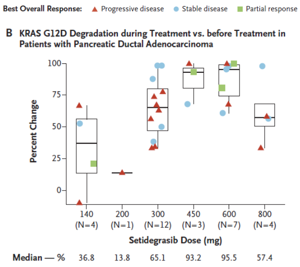 研究结论Setidegrasib的首次人体研究显示,使用选择性靶向KRAS G12D的蛋白降解剂setidegrasib治疗,主要与低级别、短暂的输注相关不良事件相关,停药率较低,且未发生治疗相关死亡。在晚期PDAC患者中,该药物显示出初步的抗肿瘤活性。作为一款针对突变型KRAS蛋白的首创蛋白降解剂,setidegrasib表现出明确的临床活性,表明靶向蛋白降解是治疗KRAS p.G12D驱动实体瘤的一种可行新策略。上述结果支持继续推进setidegrasib的临床开发,尤其是在合理联合治疗策略中用于此类患者。