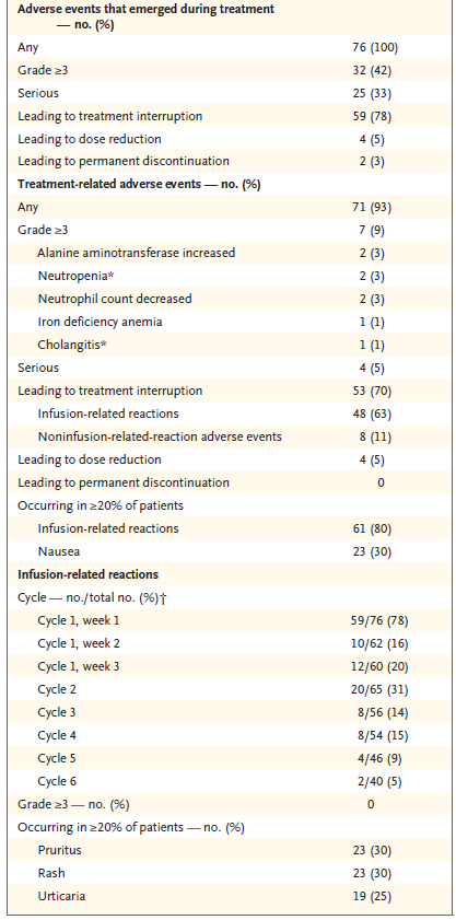 安全性在接受600 mg剂量setidegrasib治疗的76例患者中,所有患者均报告了治疗期间出现的不良事件(TEAE),其中71例(93%)报告了任何级别的治疗相关不良事件(TRAE)(表1)。然而,在首次人体试验中,治疗相关性的归因并不精确。2例患者因AE而停止治疗。最常见的TRAE(发生率≥20%)是输液相关反应(61例,80%)和恶心(23例,30%)。在输液相关反应中,最常见表现为瘙痒(23例,30%)、皮疹(23例,30%)和荨麻疹(19例,25%),且均为1~2级,未观察到≥3级的输液相关反应。输液相关反应导致48例患者(63%)暂时中断给药,但未导致永久停药。输液相关反应最常发生于首次给药期间(59例,78%),后续给药中发生率降低。整体安全性数据显示,32例患者(42%)发生≥3级AE,其中7例(9%)为≥3级TRAE。4例患者(5%)发生严重TRAE,4例(5%)因TRAE导致剂量降低(表1),但无TRAE导致永久停药或死亡。