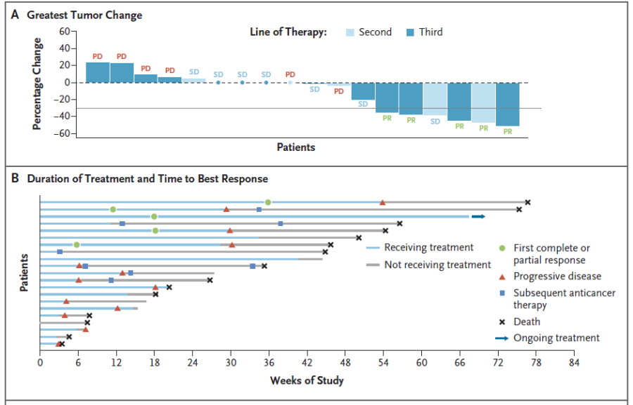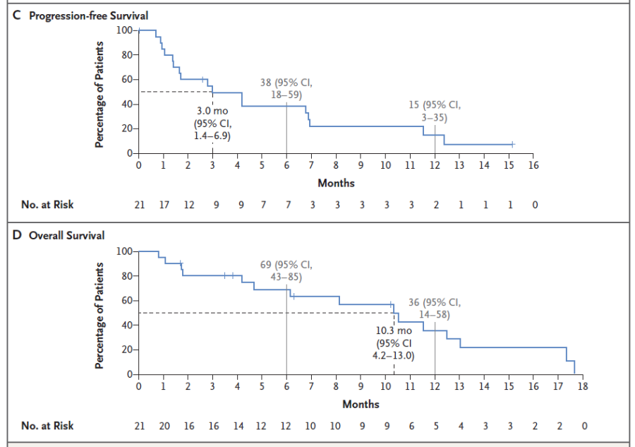 PDAC患者的中位年龄为65岁(范围:36~79岁),中位既往治疗线数为2线(范围:1~5线)。26例(84%)曾接受过吉西他滨联合紫杉醇或白蛋白结合型紫杉醇治疗,16例(52%)曾接受过改良FOLFIRINOX方案(亚叶酸钙、氟尿嘧啶、伊立替康和奥沙利铂)治疗。