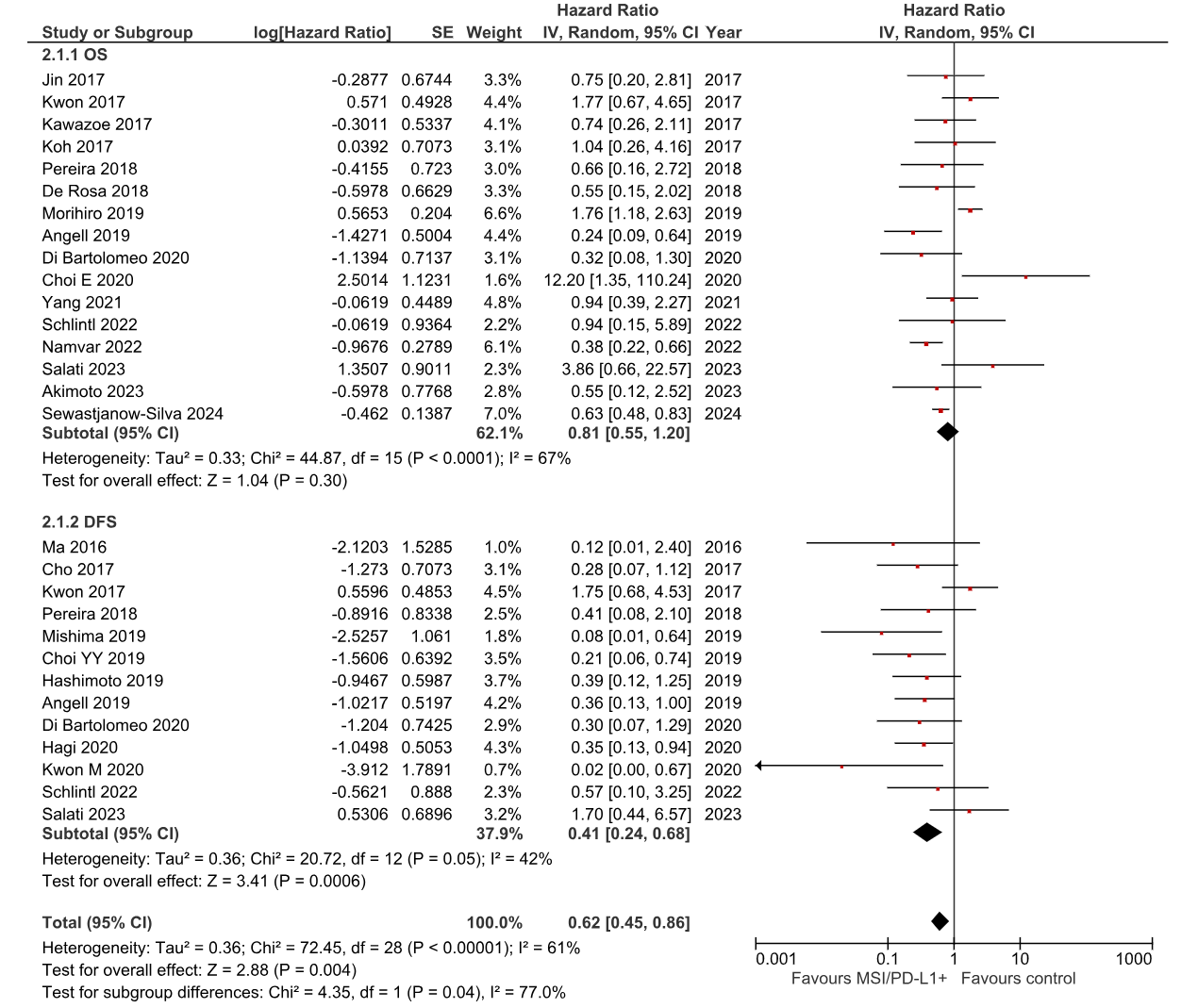 OS和DFS的合并分析显示,总体HR为0.63(95%CI:0.42~0.93,P=0.02),支持MSI-H/PD-L1阳性肿瘤预后更佳,但研究间存在较高的异质性(I²=64%,P<0.0001)。