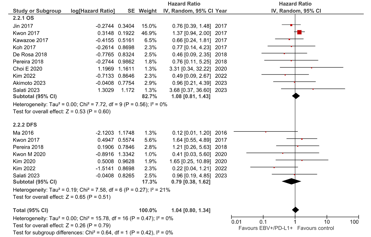 图2. 森林图展示了胃癌患者中EBV阳性/PD-L1阳性状态与生存结局之间的关联。图A(2.2.1):包含8项研究的OS分析;图B(2.2.2):包含4项研究的DFS分析