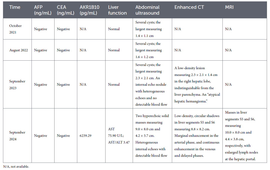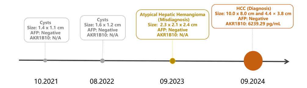 2025年9月复查显示肿瘤大小为7.8×7.6 cm,血清AKR1B10降至541.00 pg/mL,AFP持续阴性(2.95 ng/mL)。但患者出现肝病面容、皮肤巩膜黄染、肝掌等肝功能失代偿征象,本次未再行TACE治疗。图4动态展示了肿瘤影像与血清AKR1B10水平的时序变化。在整个治疗过程中,血清AFP水平始终维持阴性。