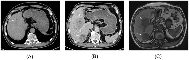 (A)2023年9月腹部平扫及增强CT显示,肝右叶可见一低密度灶,大小约2.3×2.1×1.4 cm,当时拟诊为“不典型肝血管瘤”。(B)2024年9月上腹部增强CT提示,肝S5、S6段各见一边界相对清晰的类圆形低密度影,较大者约8.8×8.2 cm。增强后动脉期病灶边缘呈明显强化,静脉期及延迟期持续强化。(C)2024年9月上腹部MRI(包括平扫、增强、弥散加权成像及磁共振胰胆管成像)显示,肝S5、S6段占位性病变大小分别约为10.0×8.0 cm及4.4×3.8 cm,肝门区可见淋巴结肿大。