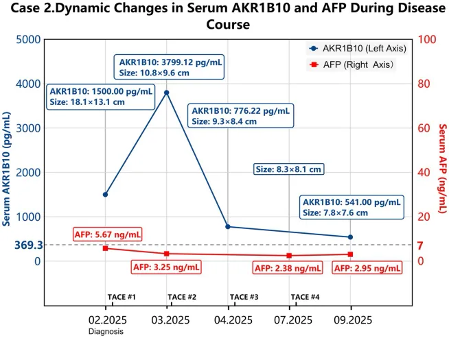 在病例2中,血清AKR1B10水平在TACE治疗后呈现动态波动,凸显了其作为HCC疗效监测敏感标志物的潜力。首次介入治疗后,随着原发肿瘤体积显著缩小,血清AKR1B10水平出现一过性升高,这可能源于治疗导致的肿瘤细胞坏死与内容物释放,提示治疗有效;后续随着治疗继续,其水平逐步下降并与肿瘤体积缩小趋势一致,进一步支持了其作为治疗反应标志物的价值。这些发现凸显了开展大规模前瞻性临床研究以明确其临床应用地位的必要性。