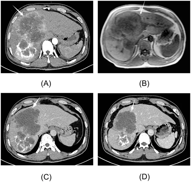 (A)初诊时腹部增强CT显示肝内巨大占位,最大截面约18.1×13.1 cm。(B)初诊时肝脏MRI(平扫及肝细胞特异性增强)提示肝内病变,最大截面约11.8×13.5 cm。(C)首次经导管动脉化疗栓塞术(TACE)后,肿瘤最大截面缩小至10.8×9.6 cm。(D)第三次TACE后,肿瘤进一步缩小至8.3×8.1 cm。