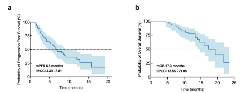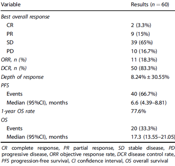 疗效结果ORR为18.3%,DCR为83.3%,PFS为6.6个月,OS为17.3个月ORR为18.3%,包括2例完全缓解(CR)和9例部分缓解(PR),该结果未达到预设的主要终点。DCR为83.3%。在最佳疗效评估为疾病稳定(SD)的39例患者中,有28例患者出现不同程度的肿瘤缩小。平均缓解深度(DpR)为8.24%(标准差±30.55%)。详细疗效数据见表1,各患者肿瘤负荷较基线的最大变化以瀑布图形式呈现(图1)。中位PFS为6.6个月(95%CI,4.39~8.81;表1及图2a)。OS方面, 1年OS率为77.6%,中位OS为17.3个月(95%CI,13.55~21.05;表1及图2b)。