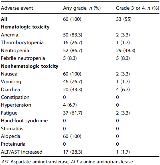 安全性结局:多数不良事件可逆,安全性可控所有60例入组患者均接受了安全性评估。治疗相关不良事件(TRAE)发生率为100%(60/60),其中55%(33/60)的患者经历了3/4级TRAE。观察到的毒性主要表现为血液学及胃肠道毒性,与伊立替康和TAS-102的已知副作用相符。最常见的任何级别TRAE包括恶心(100%)、中性粒细胞减少症(86.7%)和贫血(83.3%)。最常见的3/4级TRAE为中性粒细胞减少症(48.3%)、发热性中性粒细胞减少症(8.3%)和腹泻(6.7%)(表2)。其中,5例患者发生发热性中性粒细胞减少症,均接受了粒细胞集落刺激因子(G-CSF)治疗。多数不良事件可逆,临床上可通过支持治疗、剂量调整或暂时中断给药得到控制。