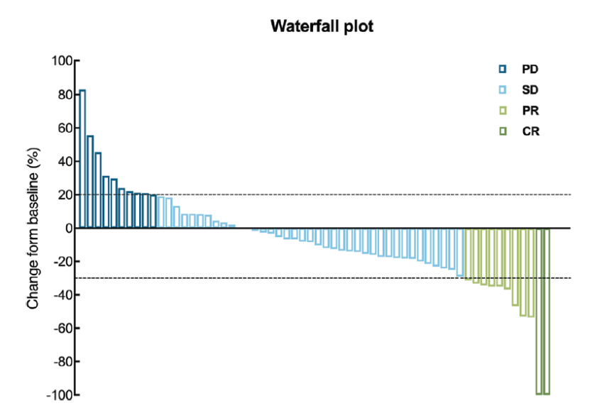 20%处的虚线表示疾病进展(PD)的阈值,-30%处的虚线表示PR的阈值。