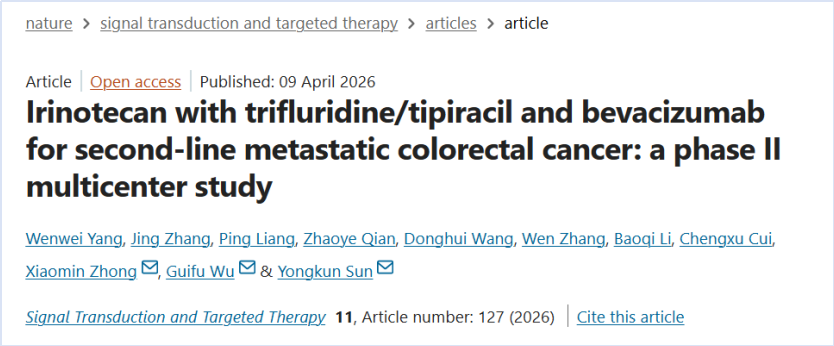编者按转移性结直肠癌(mCRC)在初始治疗失败后,往往面临后续疗法有限、预后不佳的困境。近期,一项由中国学者开展的多中心、单臂Ⅱ期临床试验(NCT06202001)为这一难题带来新希望。该研究旨在评估伊立替康联合曲氟尿苷替匹嘧啶(TAS-102)及贝伐珠单抗作为mCRC患者二线治疗方案的疗效与安全性,入组对象均为既往接受含氟尿嘧啶及奥沙利铂方案化疗后耐药患者。研究结果显示,该联合方案在二线治疗中表现出良好的抗肿瘤活性,且安全性可控,为治疗选择有限的患者提供了新的方向。相关成果已正式发表于Signal Transduction and Targeted Therapy。本期推文将带您深入了解该研究的核心数据与临床意义。