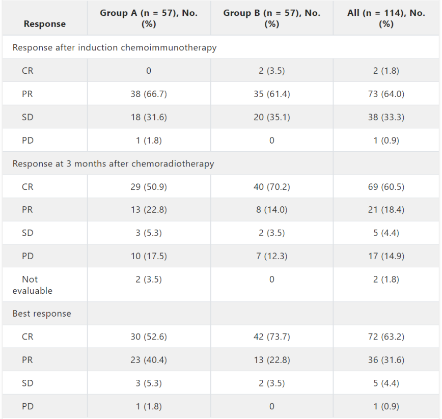 2022年10月至2024年10月期间,114例患者被随机分配至A组(N=57)和B组(N=57)。两组间的基线特征均衡,历史对照组的主要基线特征也显示出与A组和B组具有可比性。在治疗依从性方面,114例患者中有113例(99.1%)完成了计划的两个周期免疫化疗诱导治疗,A组(98.2%)和B组(100%)的完成率相当。每组各有53例患者(93.0%)完成了计划的放疗方案。