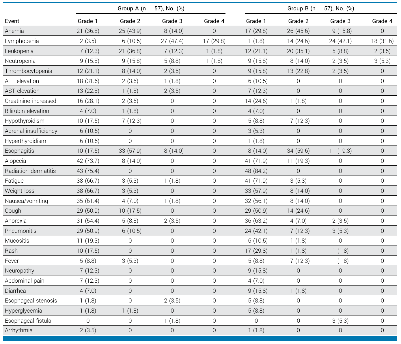 安全性全部114例患者均纳入了安全性评估(表2)。A组和B组分别有86.0%和80.7%患者发生3级及以上的治疗相关不良事件。A组最常见的3级及以上不良事件为淋巴细胞减少症(77.2%)、白细胞减少症(14.0%)和贫血(14.0%);B组则为淋巴细胞减少症(73.7%)、食管炎(19.3%)和贫血(15.8%)。未发生治疗相关死亡,两种方案均显示了良好可控的安全性。