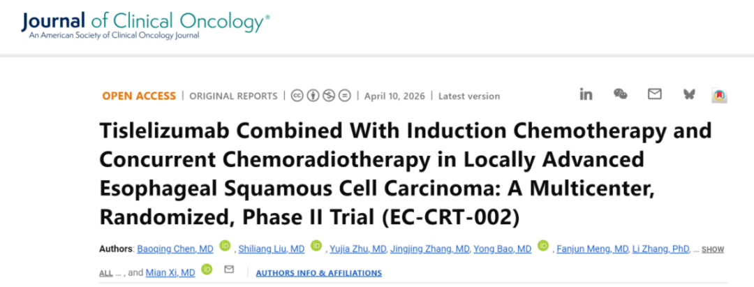 Chen B, et al. Tislelizumab Combined With Induction Chemotherapy and Concurrent Chemoradiotherapy in Locally Advanced Esophageal Squamous Cell Carcinoma: A Multicenter, Randomized, Phase II Trial (EC-CRT-002). J Clin Oncol. 2026 Apr 10:JCO2503044.