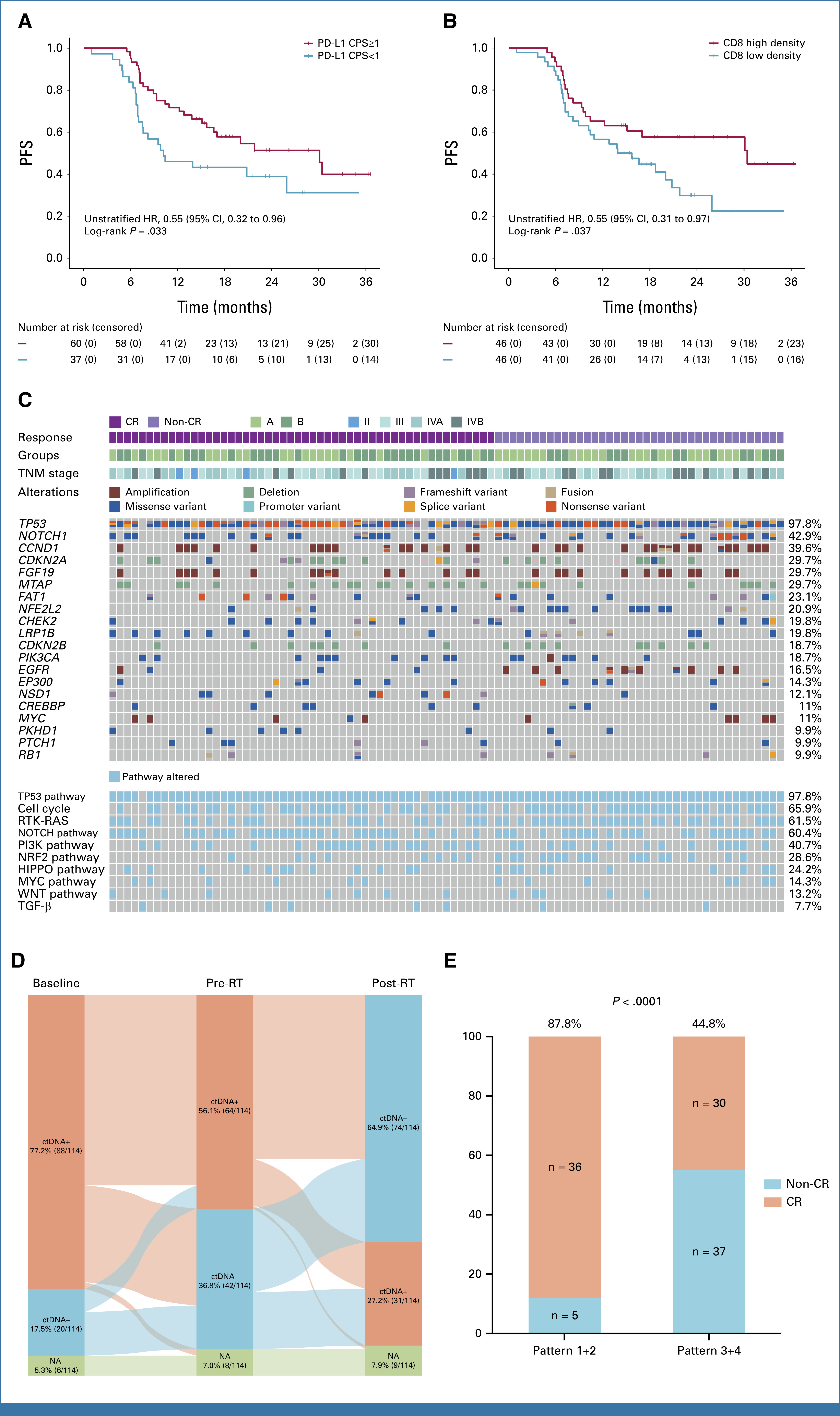 生物标志物探索探索性分析揭示了多项关键预后指标(图2):PD-L1 CPS≥1与更高的完全缓解率(68.3% vs. 43.2%,P=0.026)及更优的无进展生存期(HR=0.55,P=0.033)相关;CD8+T细胞高密度与无进展生存期改善相关(HR=0.55,P=0.037)。基因突变分析显示,NFE2L2基因及NRF2通路突变与较低完全缓解率和较差的无进展生存期相关,且NRF2通路突变在A组更常见(P=0.04);ctDNA动态监测提示,治疗后ctDNA持续阴性或早期清除的患者,完全缓解率更高、无进展生存期更优。上述发现为精准筛选获益人群、实施个体化治疗提供了重要依据。