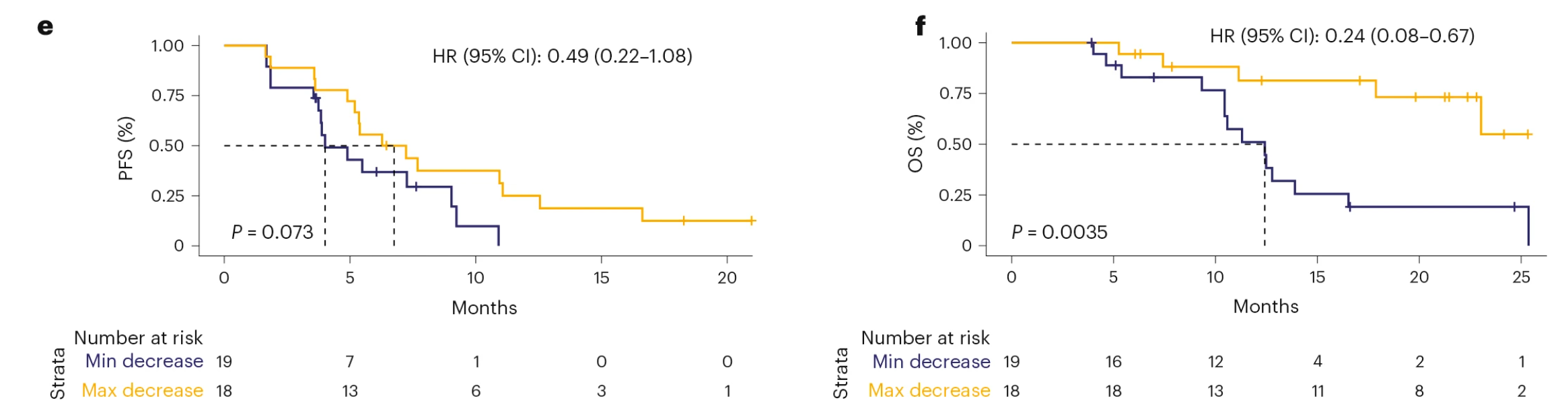 图4. 根据NR4A家族基因表达降低程度(最小降低 vs. 最大降低)对患者进行分层,绘制的PFS与OS Kaplan-Meier曲线及HR