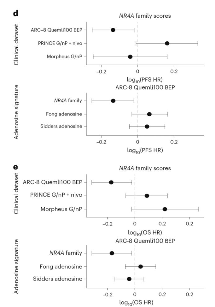 值得注意的是,在来自PRINCE研究(G/nP+纳武利尤单抗)和Morpheus-PDAC研究(G/nP)的两个外部队列中,NR4A表达水平并未观察到与患者生存获益显著相关,进一步支持ARC-8中观察到的临床获益至少部分是由Quemliclustat驱动的(图3)。