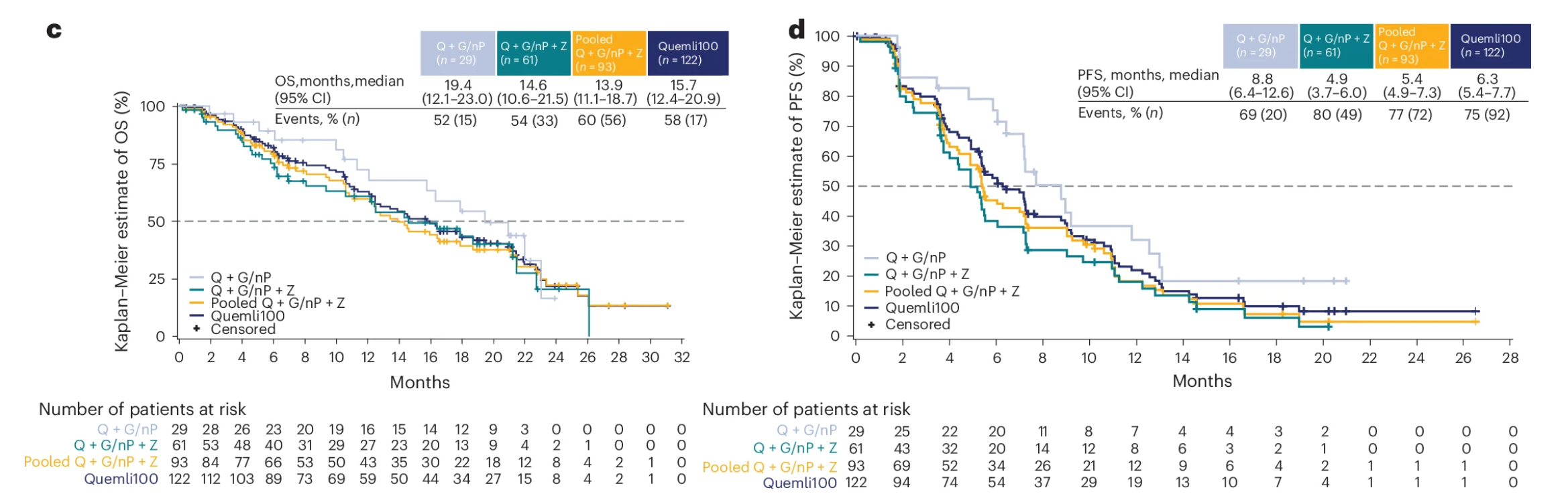 生存期分析:中位OS在Q+G/nP组为19.4个月,优于Q+G/nP+Z组的14.6个月。中位PFS同样呈现相似趋势,两组分别为8.8个月与4.9个月。表1. 临床缓解