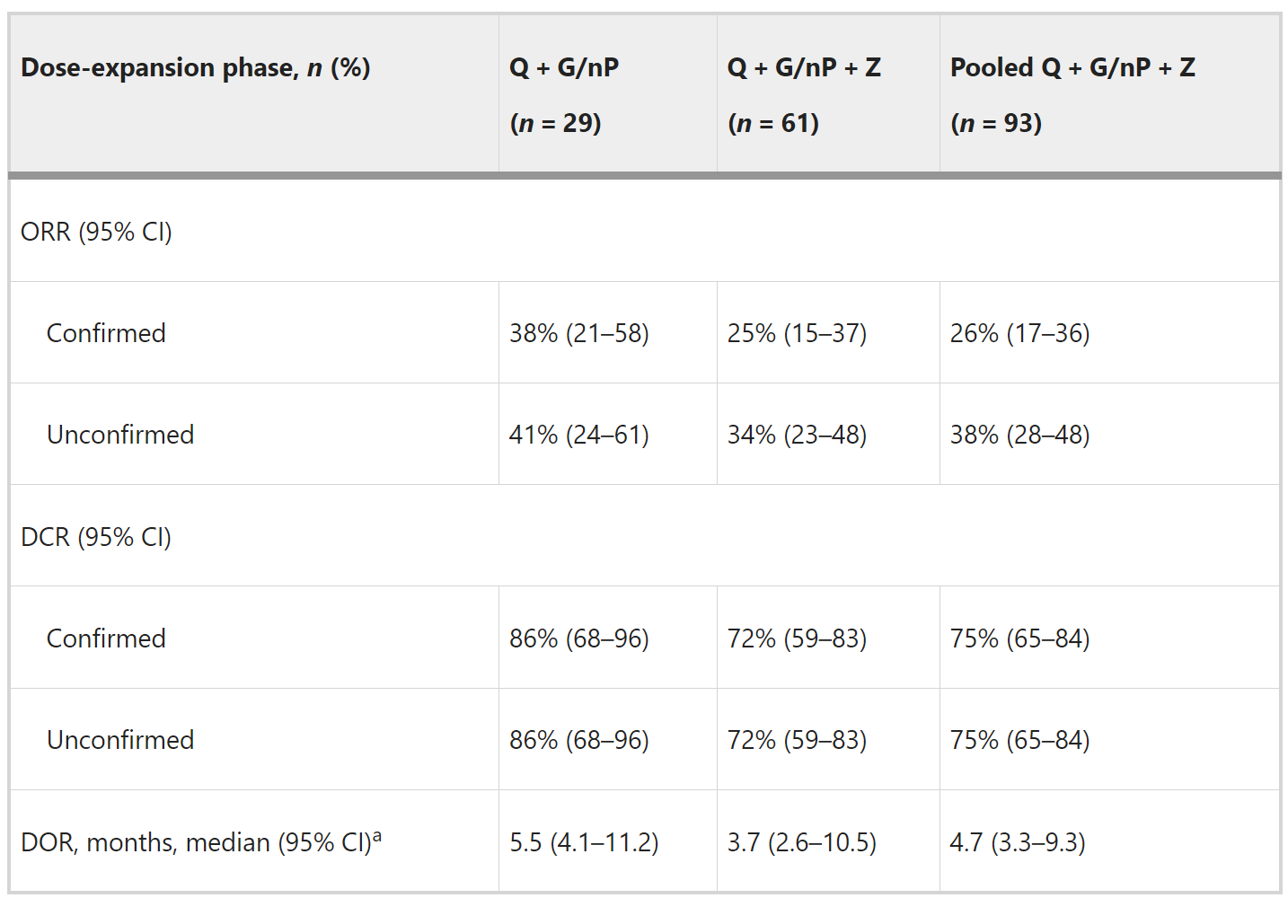 ORR:Q+G/nP组的确认ORR为38%,高于Q+G/nP+Z组的25%。未确认ORR在两组中分别为41%和34%。