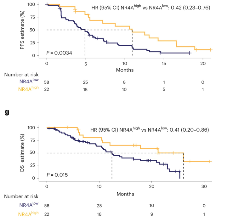图2. 基线肿瘤中NR4A基因高表达患者与低表达患者的Kaplan-Meier生存曲线图